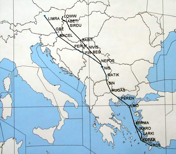 LOWW - LGRP ABETI1C UY55 BABTIT UN739 NEPOS UL617 NIS UW44 RAXAD UL609 RUGAS UB5 FSK UL609 PEREN/N0459F410 UL609 MES UZ501 KOPAR ASIMI1C Schedule: VIE 00:30 UTC RHO 03:10 UTC LGRP - LOWL ASIMI1A UL995 KOPAR UH59 LARKI/N0463F360 UL609 RAXAD UW44 NIS UL617 GOLVA/N0455F400 UL604 LIMRA LNZ Schedule: RHO 04:10 UTC LNZ 06:50 UTC